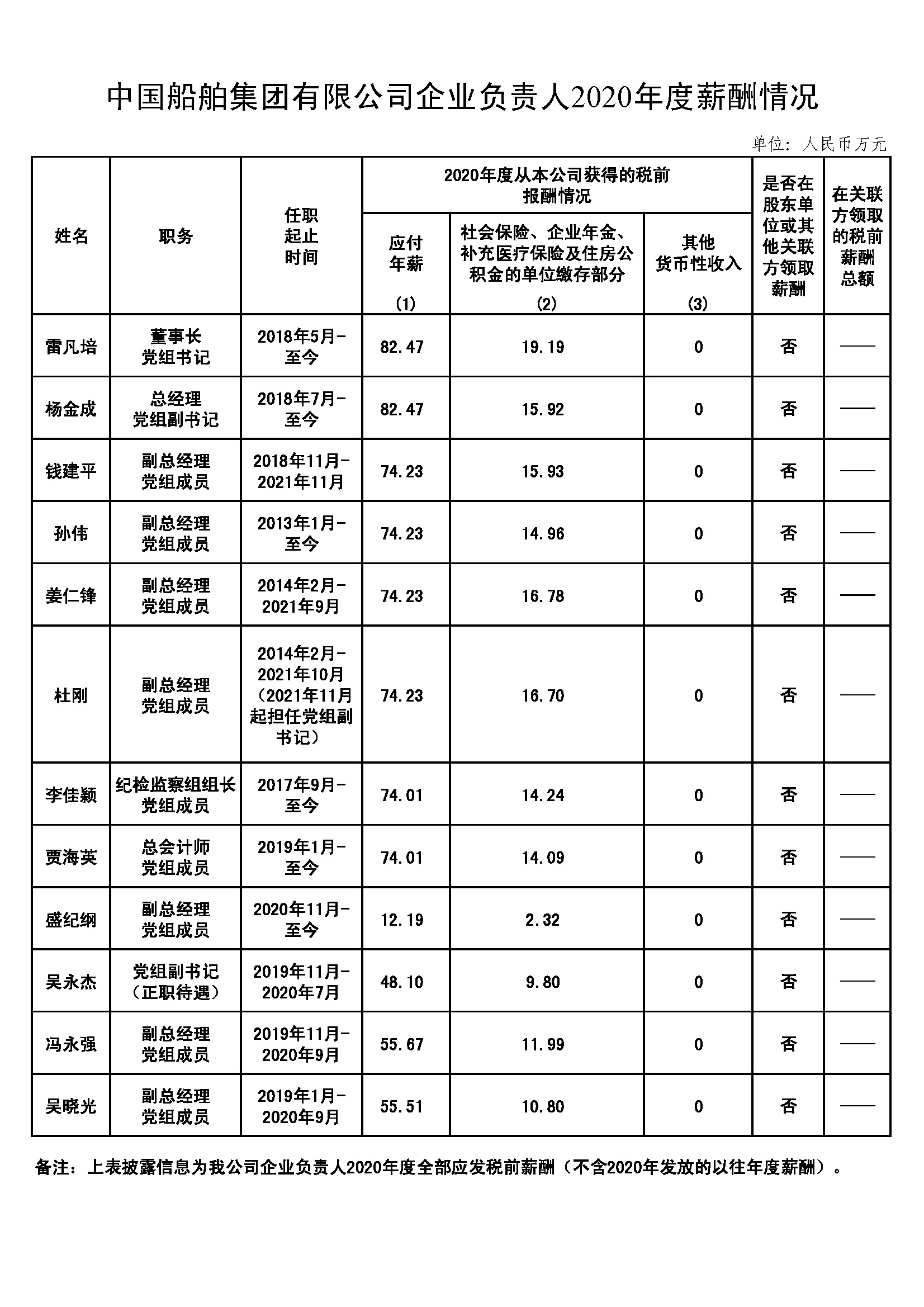 中国船舶集团有限公司企业负责人2020年度薪酬情况