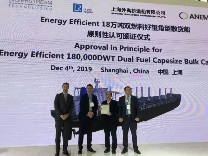 12月4日,中国船舶集团所属上海外高桥造船有限公司隆重推出两款集多种节能环保技术于一身的“Energy Efficient”18万吨级双燃料好望角型散货船和30万吨级双燃料超大型原油船新船型。展会上,英国劳氏船级社为18万吨级双燃料好望角型散货船颁发了AiP证书;英国劳氏船级社和美国船级社为30万吨级双燃料超大型原油船颁发了AiP证书。