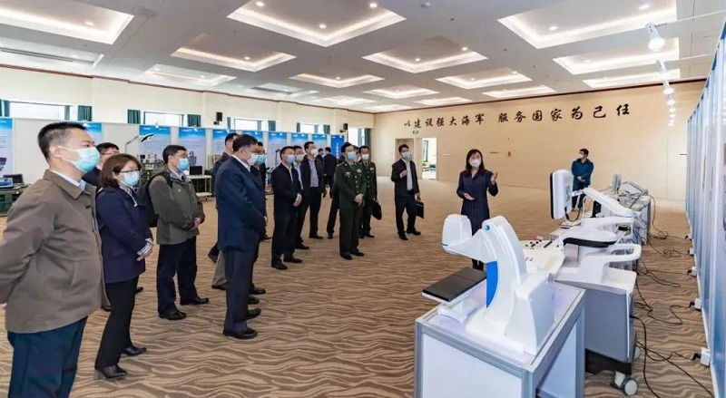 庄树新一行参观了中国船舶集团骨干卫勤装备和彩色多普勒超声诊断仪等医疗器械展示,听取了中国船舶集团部署推进应急医疗卫勤装备、智能移动方舱医院与高端医疗器械领域关键核心技术攻关及产业化发展等有关情况汇报。