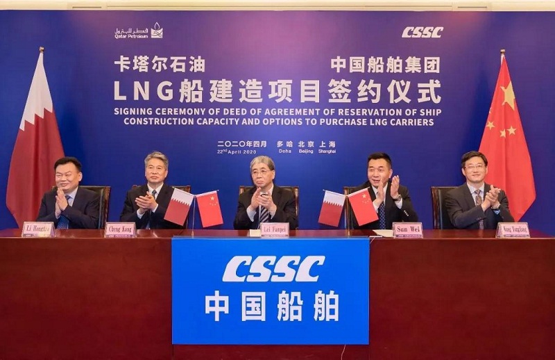4月22日,中国船舶集团与卡塔尔石油公司在中国北京、上海及卡塔尔多哈三地以“云签约”方式联合签署“中国船舶—卡塔尔石油液化天然气(LNG)船建造项目”协议,所涉订单总金额超过200亿元人民币。这是卡塔尔天然气项目首批订单,也是中国船企迄今承接的金额最大的造船出口订单。中国船舶集团和卡塔尔石油将强强联手,依托各自优势在能源运输、装备制造及全球化服务等领域开展广泛合作。