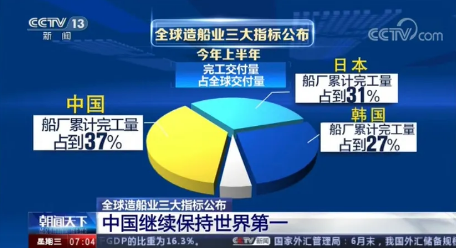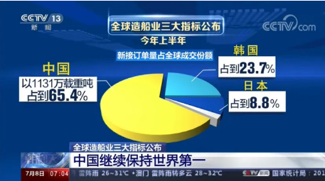 全球权威航运造船机构公布的最新数据显示,今年上半年,全球造船业三大指标,中国再次领先,继续保持世界第一的纪录。