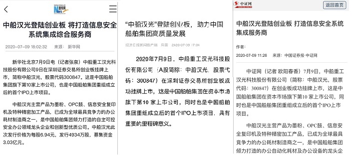 中船汉光成功上市在业内引起强烈反响,新华社、经济日报以及中国证券报等主流媒体纷纷进行了报道。