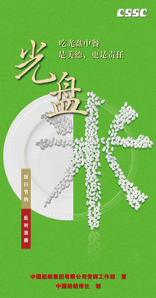 为认真贯彻落实习近平总书记关于制止餐饮浪费行为的重要指示精神,大力弘扬中华民族勤俭节约、珍惜粮食的文明用餐习惯,中国船舶集团积极开展“制止餐饮浪费 践行光盘行动”专项宣传引导活动。