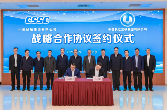2月24日,中国船舶集团有限公司与中国长江三峡集团有限公司在京签署战略合作框架协议。中国船舶集团党组书记、董事长雷凡培,三峡集团党组书记、董事长雷鸣山出席签约仪式。中国船舶集团党组成员、副总经理盛纪纲,三峡集团党组成员、副总经理王良友分别代表双方在协议上签字。