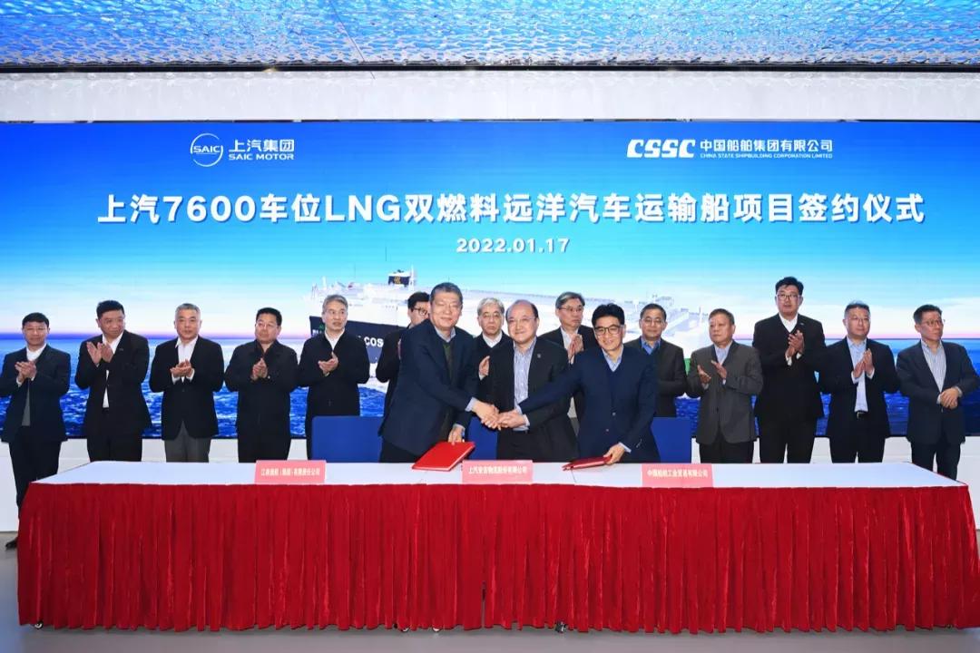 1月17日,中国船舶集团旗下江南造船携手中船贸易与上汽集团旗下安吉物流签订2艘7600车位液化天然气(LNG)双燃料远洋汽车运输船建造合同。中国船舶集团党组书记、董事长雷凡培,上汽集团党委书记、董事长陈虹出席签约仪式。