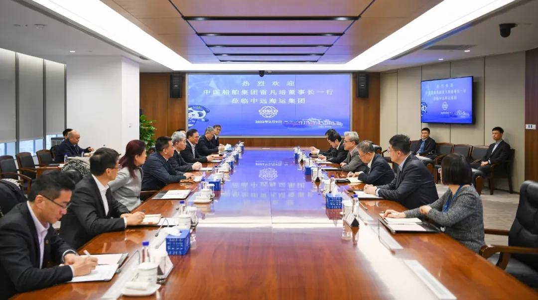 2月9日,中国船舶集团有限公司党组书记、董事长雷凡培,党组副书记、总经理杨金成一行赴中远海运大厦拜会中国远洋海运集团有限公司党组书记、董事长万敏,党组副书记、总经理付刚峰。双方互贺壬寅虎年新春,围绕深入贯彻落实国家重大战略,就进一步加强绿色燃料技术研发应用、船舶与航运业全产业链构建等领域的交流合作,携手推动我国航运业和造船业高质量发展进行了深入探讨并达成广泛共识。中国船舶集团党组成员、副总经理孙伟、盛纪纲,中远海运集团党组成员、副总经理、总会计师孙云飞参加会谈。