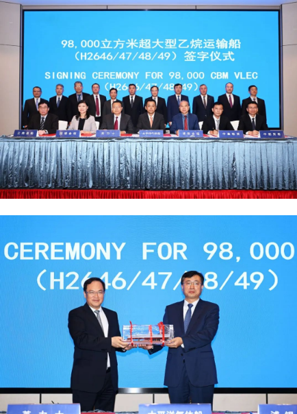 11月2日,中国船舶集团旗下江南造船(集团)有限责任公司承建的,山东海洋集团下属太平洋气体船4艘超大型乙烷运输船项目签约仪式在上海举行。中国船舶集团党组副书记、总经理杨金成,党组成员、副总经理孙伟,山东海洋集团党委书记、董事长姜国栋,党委委员、副总经理于冰出席仪式。