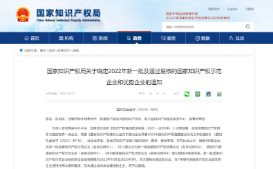 10月31日,国家知识产权局发布了《关于确定2022年新一批及通过复核的国家知识产权示范企业和优势企业的通知》(国知发运函字〔2022〕160号)。