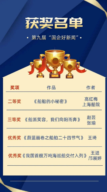 近日,第九届“国企好新闻”获奖作品正式揭晓,中国船舶集团斩获4项大奖,涵盖科普类、影音类、图片类、文字类等多种体裁。其中,二等奖1项、三等奖1项、优秀奖2项。