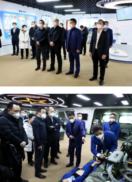 谭作钧一行参观了中国船舶集团旗下中船海神医疗科技有限公司应急医疗救援装备展厅,观摩了公司自主研制的便携式通用生命支持系统模拟急救现场演示,详细了解了有关产品的技术研发、性能指标、应用场景和生产保供能力等情况。