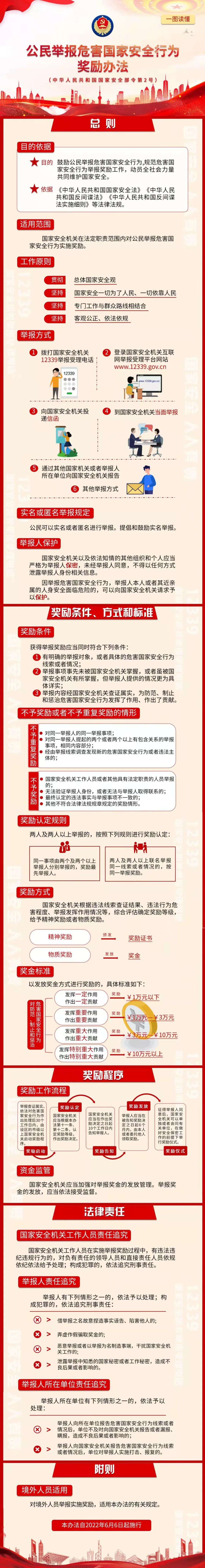2022年6月6日,国家安全部公布部门规章《公民举报危害国家安全行为奖励办法》。国家安全一切为了人民,一切依靠人民,让我们行动起来,共做国家安全的守护人!