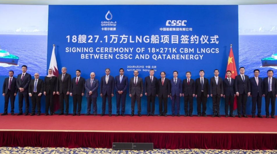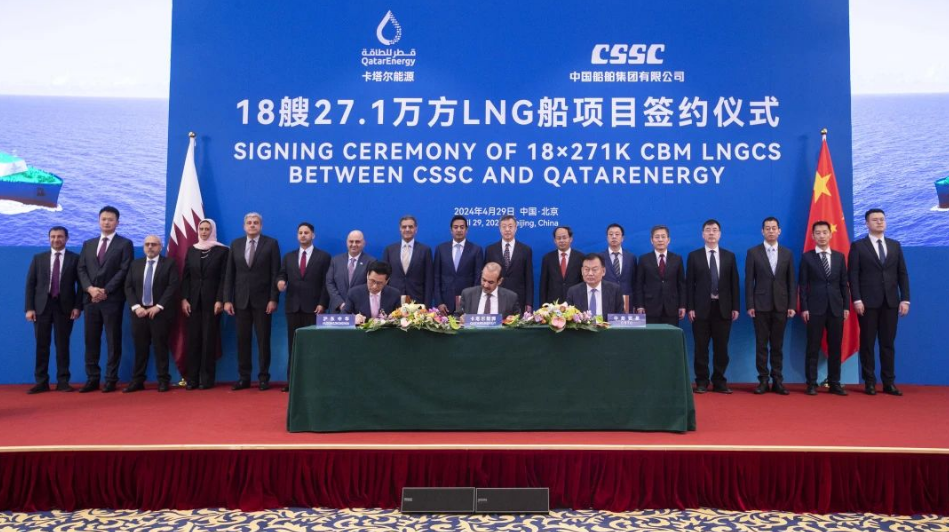 4月29日,中国船舶集团有限公司与卡塔尔能源在京举行18艘全球最大27.1万立方米超大型液化天然气(LNG)运输船项目签约仪式。工业和信息化部副部长单忠德,外交部西亚北非司大使吕健,中国船舶集团董事长温刚、副总经理盛纪纲,卡塔尔能源事务国务大臣、卡塔尔能源总裁兼首席执行官萨阿德·谢里达·阿尔卡比,卡塔尔能源天然气首席执行官卡利德·阿尔-塞尼,卡塔尔能源商务和业务发展执行副总裁贾西姆·阿尔马拉祖齐等领导和嘉宾出席签约仪式。