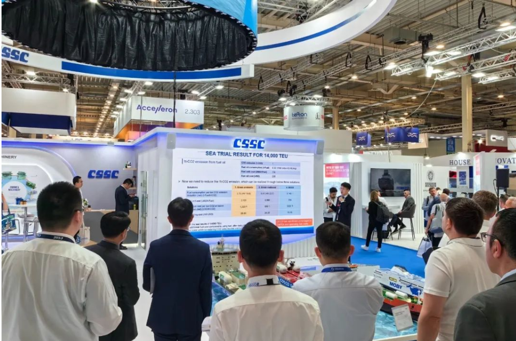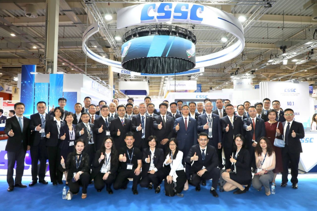 此次展会,中国船舶集团携旗下19家成员单位参展,有关成员单位负责人率队赴展会开展重点船海项目经营洽谈并拜访当地和周边国家客户。集团公司以“共赢未来”为参展主题,设置集团总体区、绿色航运解决方案区、低碳环保配套设备区共3个展示区域,重点展示了135500总吨大型邮轮、175000方LNG运输船、24000箱超大型集装箱船、210000吨氨燃料散货船、LNG双燃料VLCC等一系列高技术、高附加值明星产品,以及CPGC-WinGD 10X92DF-M甲醇双燃料发动机、船用碳捕捉系统等全球船东高度关注的绿色低碳配套设备。同时,通过展台上醒目的品牌标识、层级化的品牌体系图、富有感染力的品牌推介视频,首次面向全球客户,立体化展示“中国船舶”品牌及下属企业品牌和产品品牌体系,进一步强化了集团公司品牌形象。
