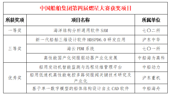 2025年1月3日,国务院国资委正式公布第四届中央企业熠星创新创意大赛获奖名单。中国船舶集团参赛项目荣获一等奖1项、三等奖3项、优秀奖3项,优秀导师4名,集团公司荣获“优秀组织单位”荣誉称号。