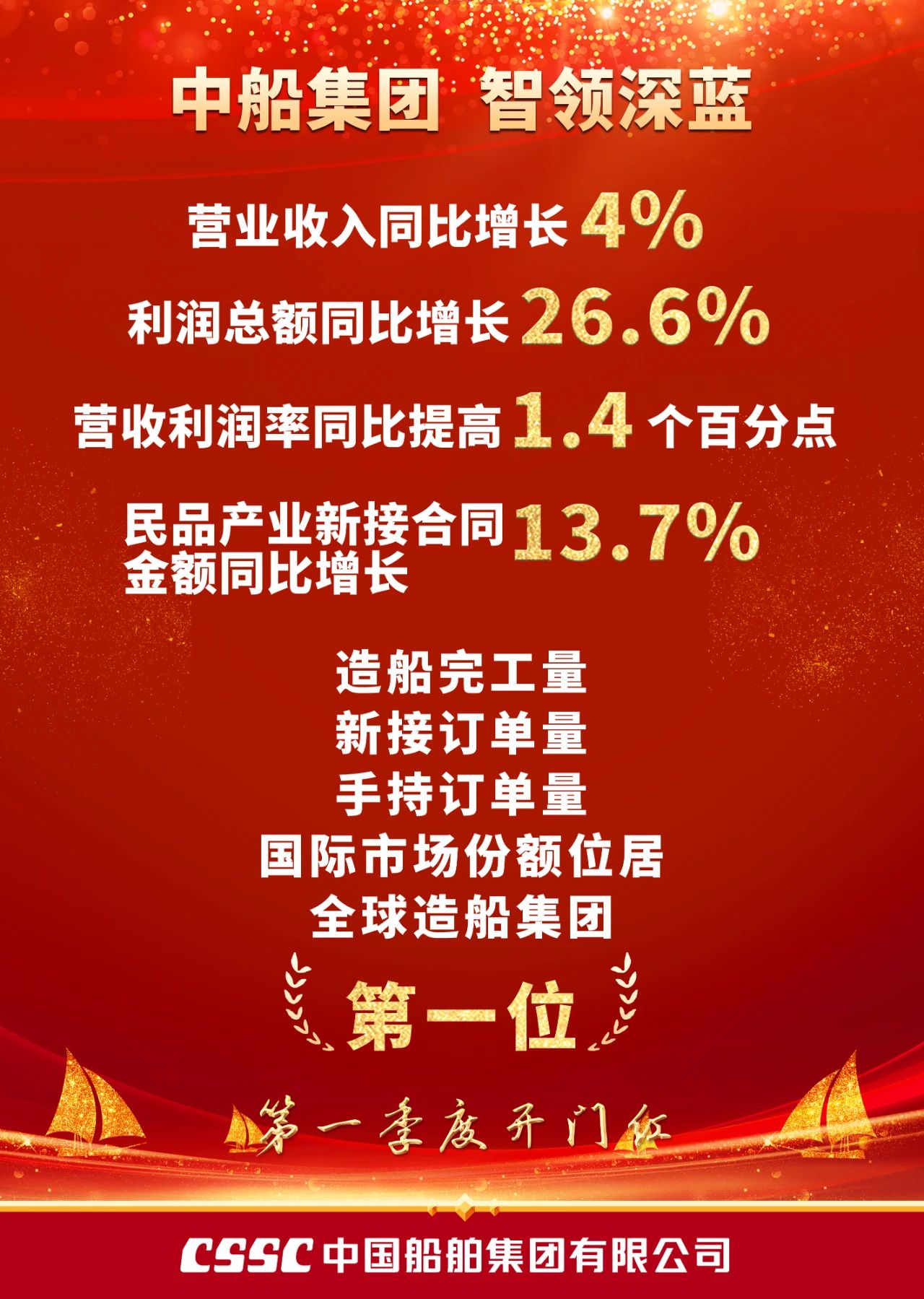一季度,中船集团营业收入同比增长4%,利润总额同比增长26.6%,营收利润率同比提高1.4个百分点,民品产业新接合同金额同比增长13.7%,造船完工量、新接订单量、手持订单量国际市场份额位居全球造船集团第一位,收获首季开门红。