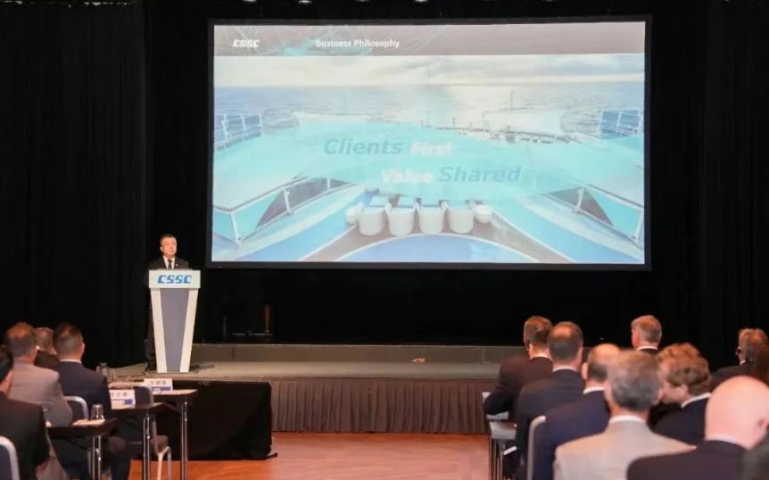 王国强向全球主要船东和合作伙伴宣讲了“中船集团 智领深蓝”的企业品牌理念,阐述了中船集团未来十年的“高端化、绿色化、智能化、共享化”战略规划方向,以及与全球广大船东用户“开放合作、共创共赢”的经营理念。他强调,作为全球船舶市场绿色低碳发展的引领者、践行者和先行者,中船集团始终坚持创新驱动的发展理念,以构建海洋命运共同体为使命,持续加快核心技术协同攻关,不断深化与全球航运企业及国际海事界的多赢合作。