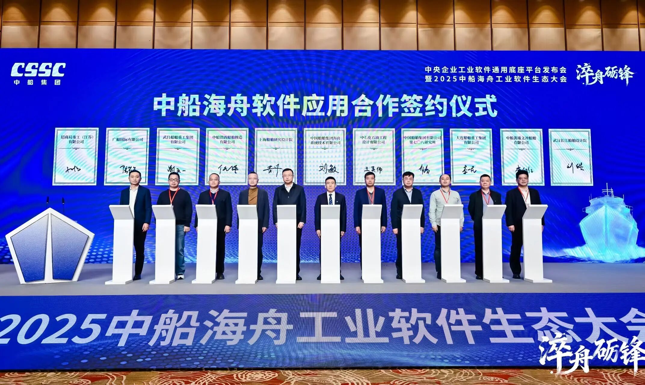在与会嘉宾的共同见证下,中石化石油工程设计有限公司、武汉长江船舶设计院、招商重工(江苏)有限公司以及中船集团内7家重要生态合作单位与中船海舟完成了中船海舟软件应用合作签约仪式。此次签约覆盖船舶设计、能源装备、海洋工程等多个重点领域,标志着中船海舟产业协同生态进入规模化、实质性落地新阶段。