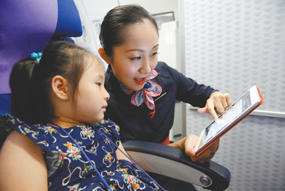 乘务员利用机上无线网络帮助无陪小旅客与家人空地联络。(资料图片)