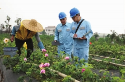 南方电网广东中山小榄供电局员工向花农宣传安全用电知识