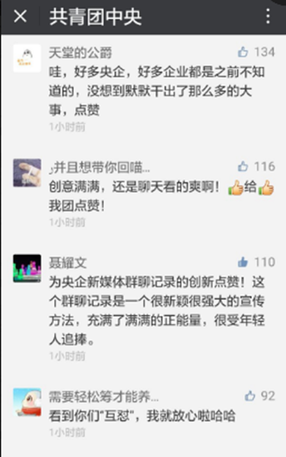 中国人民大学新闻学院教授宋建武认为,“央企新媒体群聊记录”的走红,是因为真实、接地气、参与感强,“每个人都有群聊的经历,这种方式使人们感觉亲切、有趣”,公众需要和喜闻乐见才是它能够吸引人、感染人的原因。