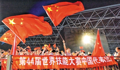 图为日前在阿拉伯联合酋长国举行的第44届世界技能大赛开幕式上,人们挥舞着中国国旗欢迎中国代表团入场。