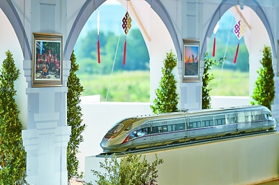 在开工仪式上展出的中国“复兴号”高铁列车模型。新华社发