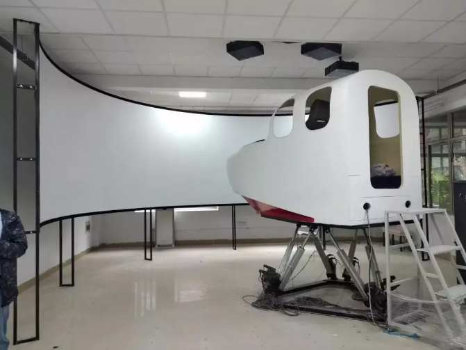 该平台主要由地效翼船驾驶舱、六自由度运动平台、工控机、激光高清工程投影机、180°金属环形硬幕、图像处理器、飞行仿真软件等组成。驾驶座舱1:1复制交通运输部指定的唯一教具——翔州1型地效翼船,在环境上保持了与真实地效翼船的高度一致,180°金属环形硬幕最大程度再现全球各大水域的真实场景,而六自由度运动平台真实实现了地效翼船升沉、俯仰、滚转等动作,给学员身临其境的地效翼船驾控感受。
