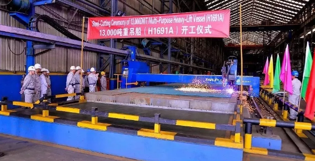 11月12日,沪东中华造船(集团)有限公司为中国船舶(香港)航运租赁有限公司建造的系列13000吨重吊船中的6号船开工。该船由上海船舶研究设计院设计,总长149.99米,型宽25.6米,型深13.5米,设计吃水6.8米,结构吃水8.3米,入级DNV GL。