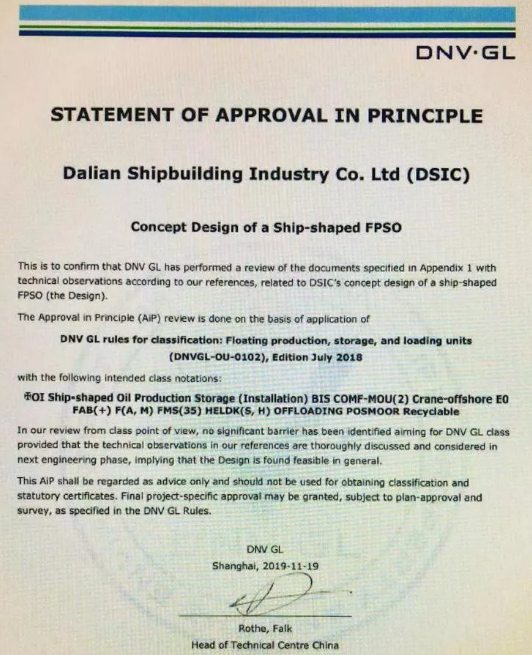 11月20日,大船集团在总部举行了“15.5万吨穿梭油船”和“通用型FPSO”设计AIP证书颁发仪式,两型新产品获得DNV·GL原则性认可。