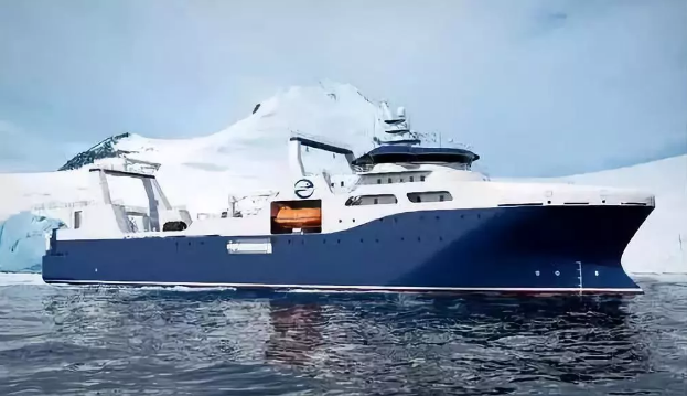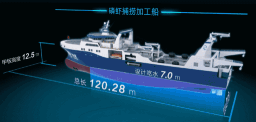 “深蓝号”由黄埔文冲建造,七〇八所参与设计,总长约120米,型宽21.6米,设计吃水7.3米,设计航速15节,主机功率8000 千瓦,载重吨约5000吨。“深蓝号”是我国自主研制建造的第一艘渔业捕捞加工一体船,也是目前最大最先进的渔业捕捞加工一体船,取得近200项知识产权保护,实现了我国现代化渔业船舶装备领域的重大突破,达到世界先进水平;主要用于南大洋渔业捕捞,兼顾海洋科考功能,可满足ICE-A冰区(冰厚度0.8米)及-25℃低温环境的营运要求。