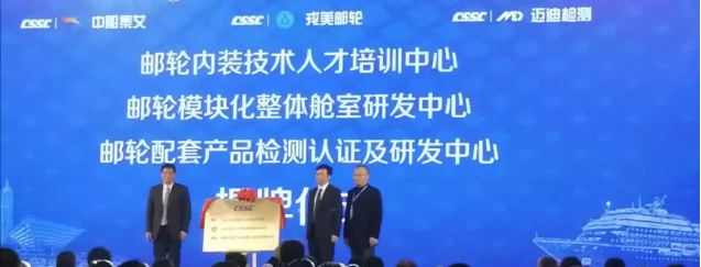 为解决我国邮轮配套产品认证难、舱室系统技术水平落后、专业人才匮乏等问题,在中船邮轮和中国船舶集团所属中船九江海洋装备(集团)有限公司的指导下,中国船舶集团所属中船集艾邮轮科技发展(上海)有限公司联合中国船级社和上海工程技术大学成立了《邮轮配套产品测试认证及研发中心》、《邮轮模块化整体舱室研发中心》和《邮轮内装技术人才培训中心》,并在会上正式揭牌。