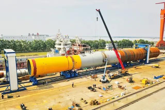 日前刚向大家介绍了中国船舶集团旗下黄埔文冲建造的单桩稳桩平台主体工程顺利成型,就在昨天又交付一海上风电产品海上风电单桩。4月14日,黄埔文冲船舶下属文船重工公司交付了为保利长大工程有限公司建造的首个海上风电单桩。该单桩直径8.8米,长103.4米,最大板厚85毫米,重1644.3吨,已经达到一艘轻型护卫舰的重量,是目前世界上最大的风电单桩之一。