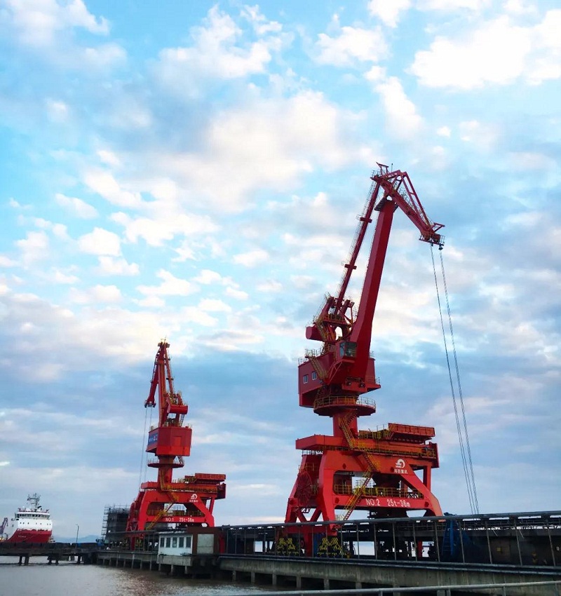 近日,武汉船机海西重机为宁波舟山港老塘山码头打造的2台25T-36M四连杆带斗门机顺利交付。门机额定起重量25吨,工作幅度36米,额定工作效率800吨/时,主要用于煤炭和海沙的卸船作业。