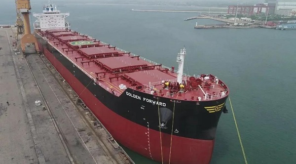 6月11日,由中国船舶集团旗下大船集团山船重工建造,中船贸易作为联合卖方,为挪威Frontline公司打造的8.2万吨散货船“GOLDEN FORWARD”号交付离厂。