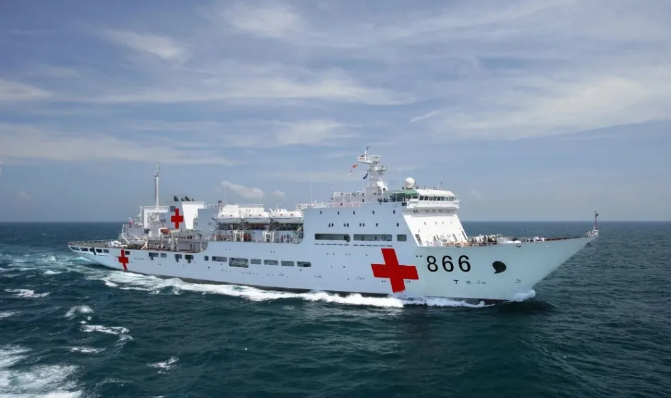 这是一艘特殊的军舰,在人民海军的序列里,她是唯一。她的甲板上,没有舰炮、鱼雷,没有导弹、火箭;她的“装备”是手术室、病房、血库;她的“武器”是CT机、X光机、药品、医疗器械;她最醒目的标志是通体的白色和船舷上大大的红十字。