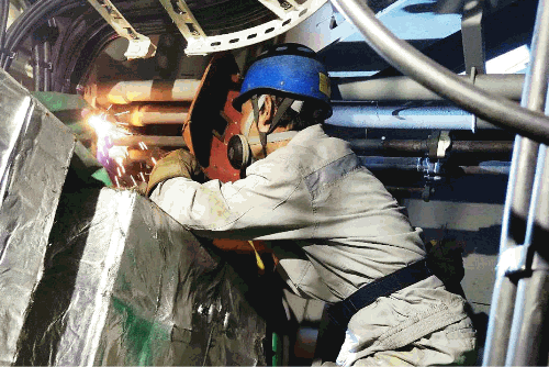 在狭小的空间里对锚机液压管进行焊接