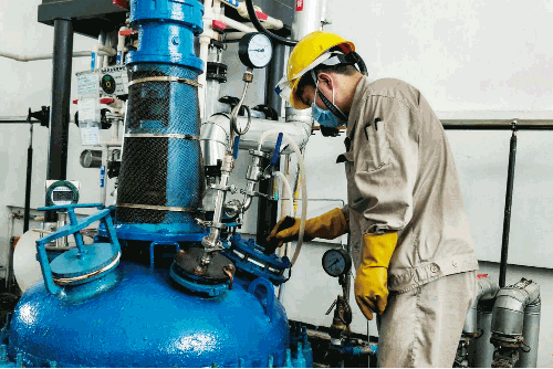 在原料药车间,七一六所杰瑞药业员工细心查看反应釜内物料反应情况。此时釜内温度高达124.8℃,近身温度超过50℃,全程反应时间约3~4小时。