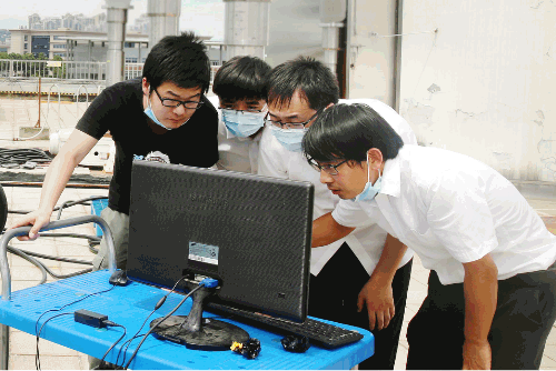 七一七所技术人员,在所内试验楼顶头顶烈日开展工作。