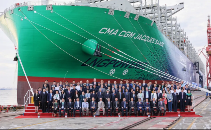 9月22日,由中国船舶集团有限公司旗下沪东中华造船(集团)有限公司和中国船舶工业贸易有限公司作为联合卖方为世界著名航运公司——法国达飞海运集团建造的全球首艘23000TEU双燃料动力集装箱船“达飞雅克•萨德”号,在上海长兴岛造船基地命名交付。中国船舶集团副总经理孙伟、达飞海运集团董事会主席鲁道夫·萨德出席仪式并致辞,教母谭雅·萨德为新船命名,法国驻沪总领事纪博伟应邀出席仪式。