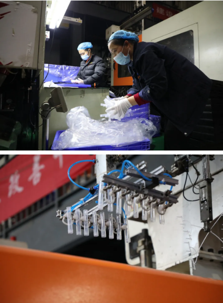 为保障防疫物品供应,春节期间,前卫公司精密模塑产业生产车间24小时不停机。各机台满负荷运转,每天生产咽拭子棉签棒1000万支,一次性保存管70万支,为全国核酸检测能力的提升提供了强有力的保障。