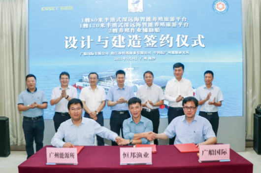 5月8日,中国船舶集团旗下广船国际 与广东省阳江市恒邦渔业有限公司签订1艘80米半潜式深远海智能养殖旅游平台建造合同,这是广东省首个商业化大型半潜式养殖旅游综合平台。