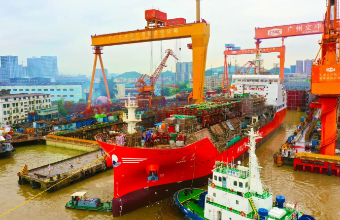中国船舶集团旗下黄埔文冲建造的9500立方米双燃料动力多用途气体运输船首制船在近日出坞。
