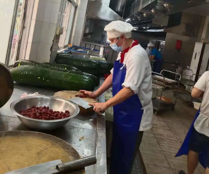 而在技校和养老院的后厨,阮积剑等厨师们同样已经整装待发。在社区封闭初期,饮食服务部养老院饭堂员工由原来的18人剧减至7人。厨师梁志宽面对每日约800人的进餐人数,迎难而上,转变菜式花样,合理优化膳食,注重营养搭配,以娴熟的厨艺独自完成后厨大量工作,保证了菜肴准时出品。而厨师、党员陈兆铭得知饭堂因受疫情影响而人手严重不足,在试航归来做完核酸检测后立即回到养老院饭堂的岗位上。为此,他直接把“家”安在了养老院,每天睡在简易折叠床上。