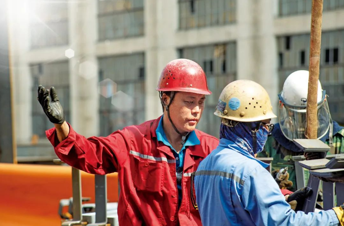 午后,吊装工人董师傅在烈日下指挥吊运。