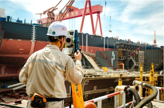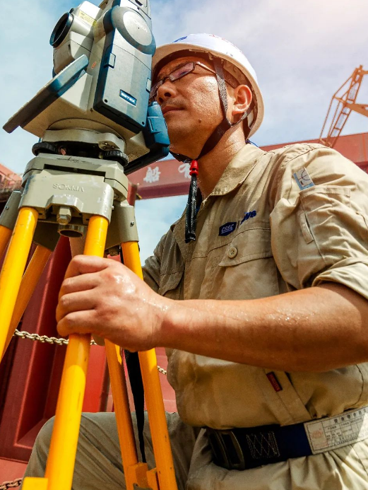 近40度的高温天气下,一位造船精度人坚守岗位,使用全站仪监控船坞每个搭载总段的定位精度,保障一次搭载到位。