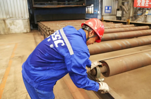 维修工闫师傅正在酷暑中检修预处理生产线辊道。