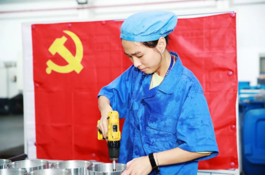 七二六所车间,在党旗的辉映下,机加工车间,钳床组张师傅正在紧张地加工零件和毛刺修整,早已顾不上汗水的洗礼。