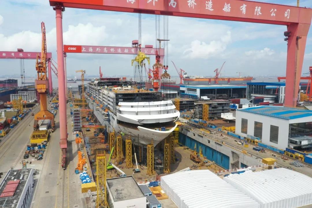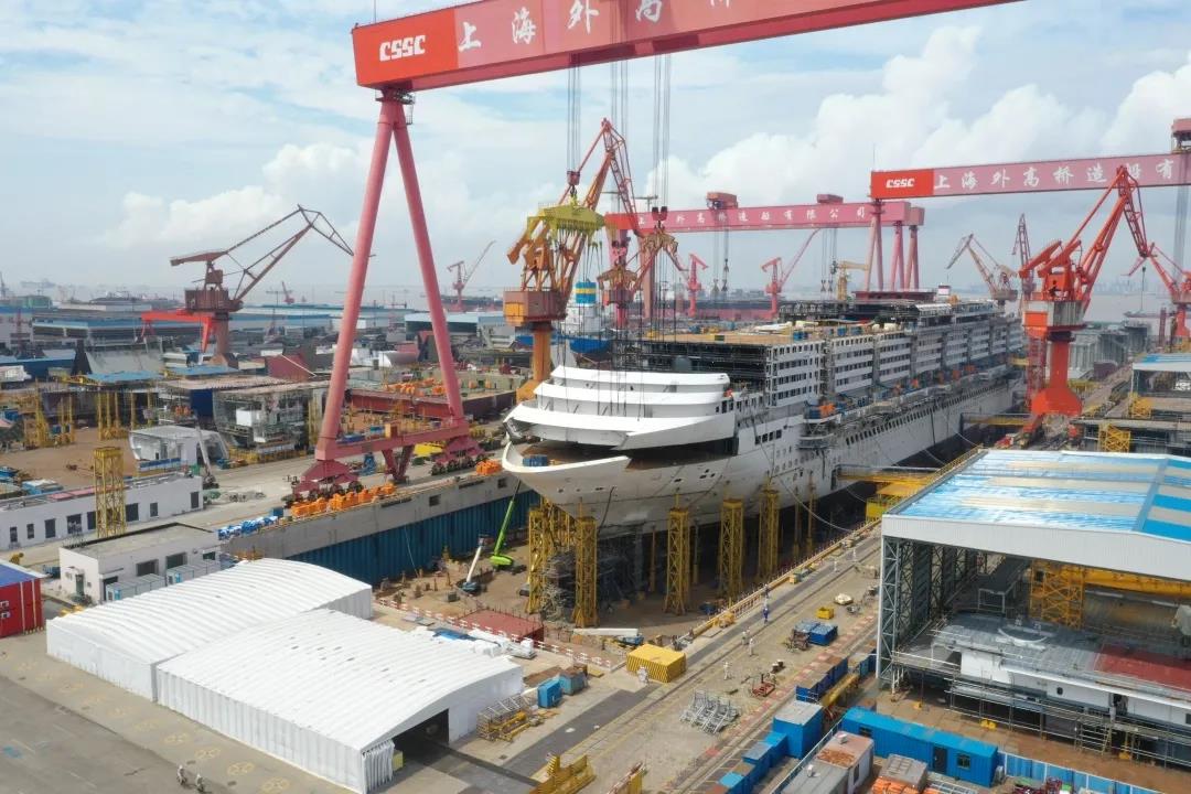国产首制大型邮轮完成首个艏部总段吊装! 预计9月实现全船结构贯通。