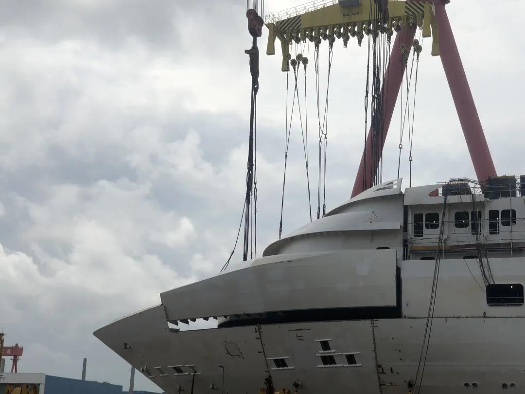这标志着国产首制大型邮轮正式开启艏部吊装模式,9月份将实现全船结构贯通这一里程碑节点。
