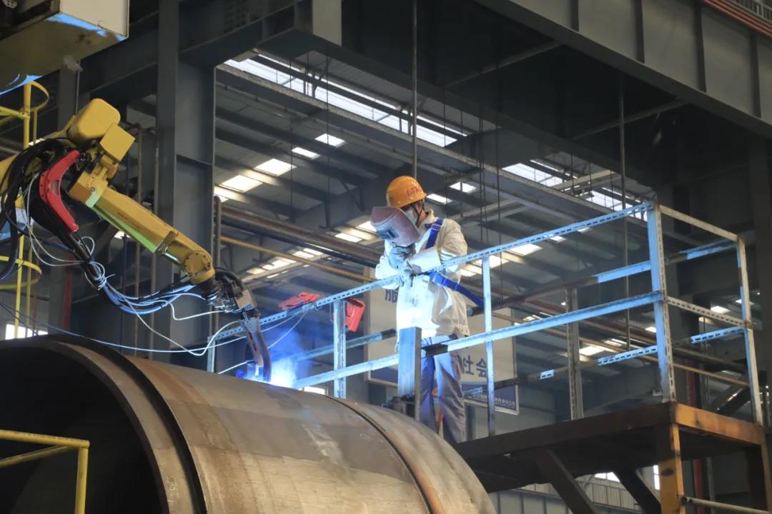 武汉船机钢构制造部员工正在操作焊接机器人焊接海工产品结构件。